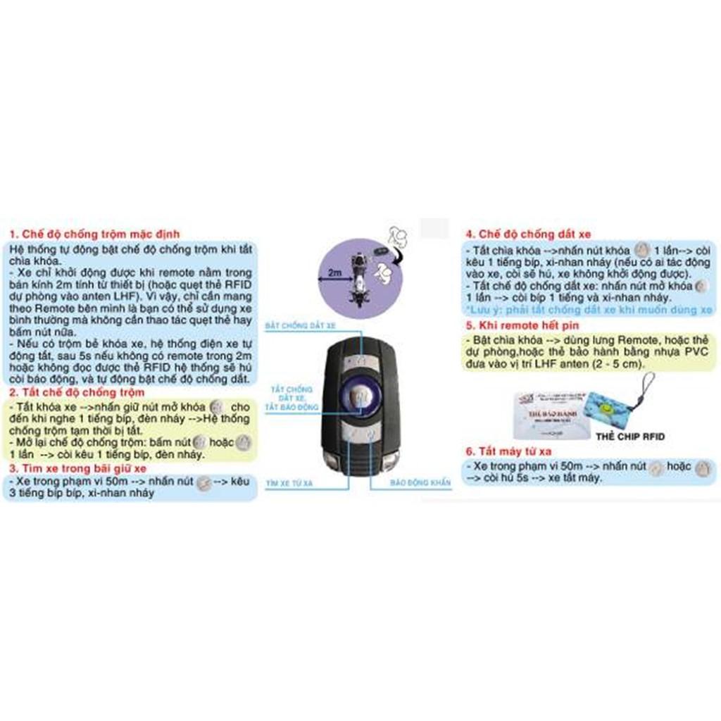 Tích hợp Remote RFID thông minh. Hệ thống tự nhận dạng người dùng trong bán kính 2m (nếu không có remote trong bán kính 2m, hệ thống bật còi báo động và tắt máy xe)
